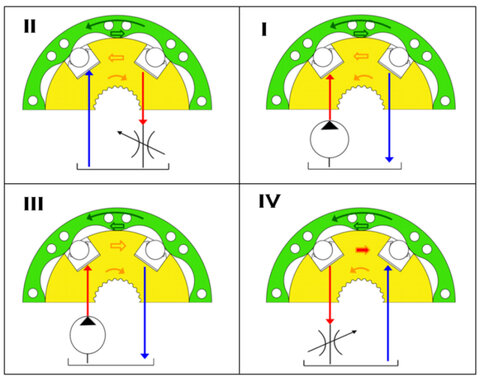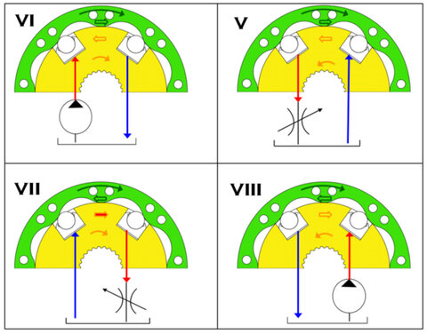 Zur Veranschaulichung der Funktion des Rotodiffs wird dieser in acht Betriebsquadranten aufgeteilt, die einzeln betrachtet und mit ihrer jeweiligen hydraulischen Schaltung dargestellt werden können (Fig. 4). In den Quadranten I, III, VI und VIII fungiert der Rotodiff als Hydromotor: die von einer Hochdruckpumpe eingespeiste hydraulische Leistung wird in Drehmoment und Drehbewegung umgewandelt. In den Quadranten II, IV, V und VII arbeitet der Rotodiff dagegen als Pumpe: die dem Rotor oder Gehäuse über eine Welle zugeführte mechanische Arbeit wird in hydraulische Leistung umgewandelt.