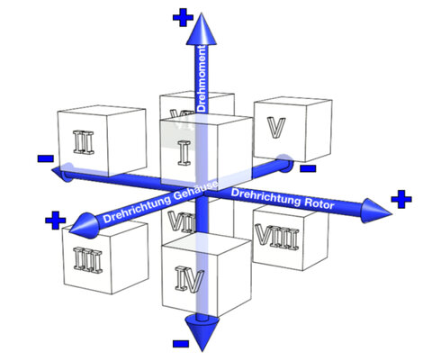 Dabei dreht sich der Rotor langsamer als das Gehäuse, also nacheilend, wohingegen in den Quadranten I, IV, VI und VII der Rotor schneller als das Gehäuse, also voreilend, läuft. In den Quadranten IV und VII muss dazu das Antriebsdrehmoment am Rotor eingeleitet werden, in II und V stehen Rotor oder Gehäuse zur Auswahl. Durch diese Schaltmöglichkeiten lassen sich Back-to-Back-Prüfstände zum einen auf verschiedenste kinematische Gegebenheiten der Prüflinge abstimmen, zum anderen können die erwünschten Belastungsparameter bequem durch hydraulische Regelung erzielt werden.