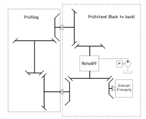 Bei Verspannprüfständen in Back-to-Back-Anordnung und mechanischem closed loop werden Ein- und Ausgangswelle des Prüflings spiegelsymmetrisch an ein baugleiches Getriebe gekoppelt. Beide werden anschliessend bis zur Nenndrehzahl beschleunigt und auf diesem Niveau im Leerlauf gehalten. In den Antriebskreis wird dann ein Drehmoment eingeleitet, wodurch die Getriebe gegeneinander verspannt werden. Über die elastische Verformung von Prüfling und Prüfstand ergibt sich ein Verspannwinkel zwischen belastetem und unbelastetem Aufbau. Geprüft wird dabei nur mit einem Bruchteil der Nennleistung der Getriebe, da nach Erreichen der Nenndrehzahl nur Leerlauf- und Verlustleistung bereitgestellt werden müssen (Fig. 2). So spart ein Helikopterhersteller bei seinen jährlich anfallenden Getriebetests im Werk so viel Strom, dass damit eine durchschnittliche Stadt mit 30 000 Einwohnern versorgt werden kann (Fig.5).